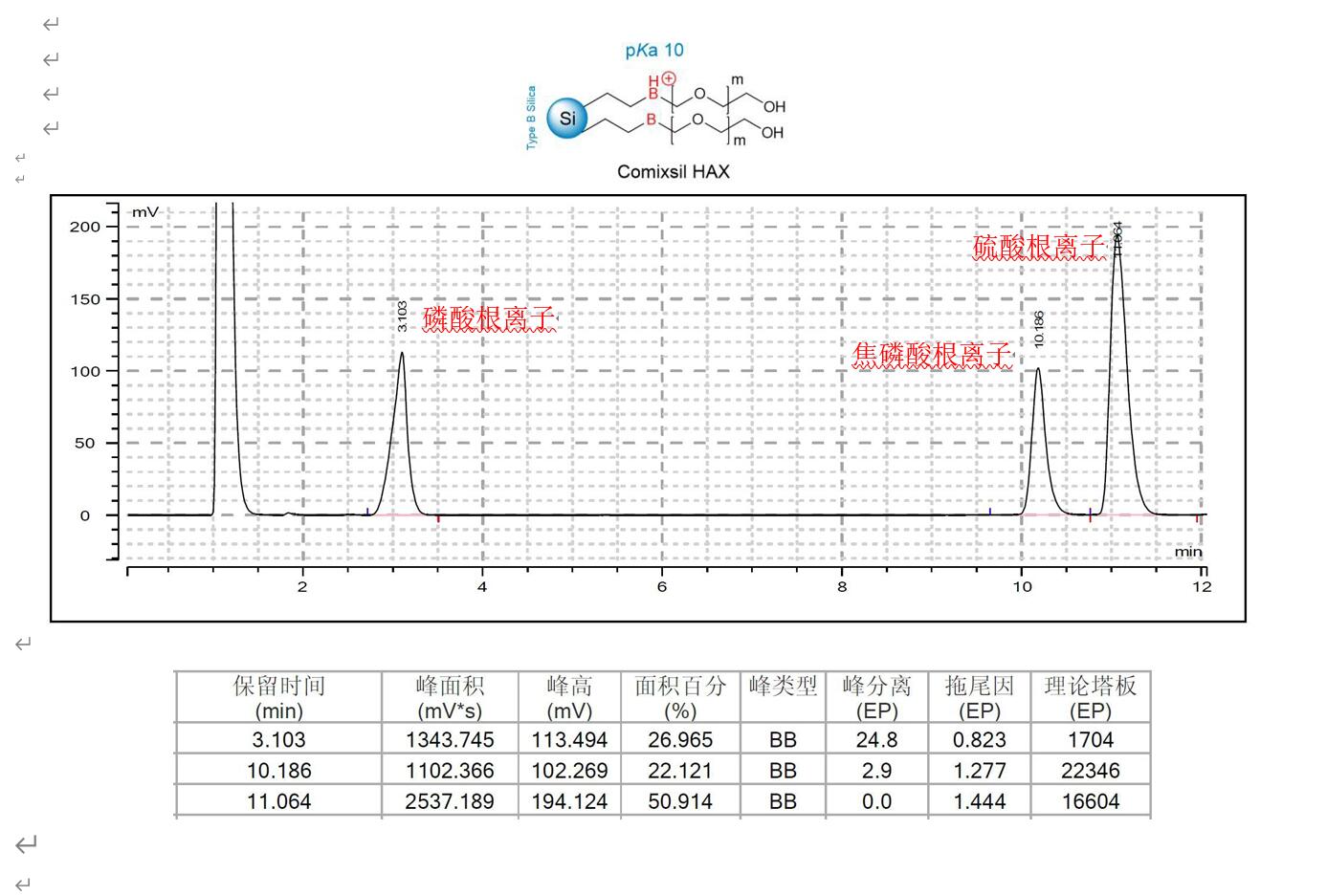 方法說明:通過 Comixsil HAX 的中等強度的陰離子交換能力保留各陰離子,通過酸的濃度調節(jié)各陰離子的保留,解決了在其他固定相上比較難解決的焦磷酸根離子的保留和峰形問題。Comixsil HAX 在高比例有機相條件下也存在強的 HILIC 作用,在本應用中,為了避免過強的保留,只發(fā)揮其陰離子交換的作用。