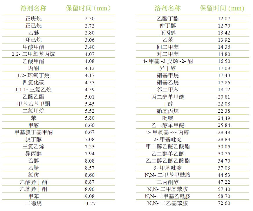 54 種溶劑保留時間列表