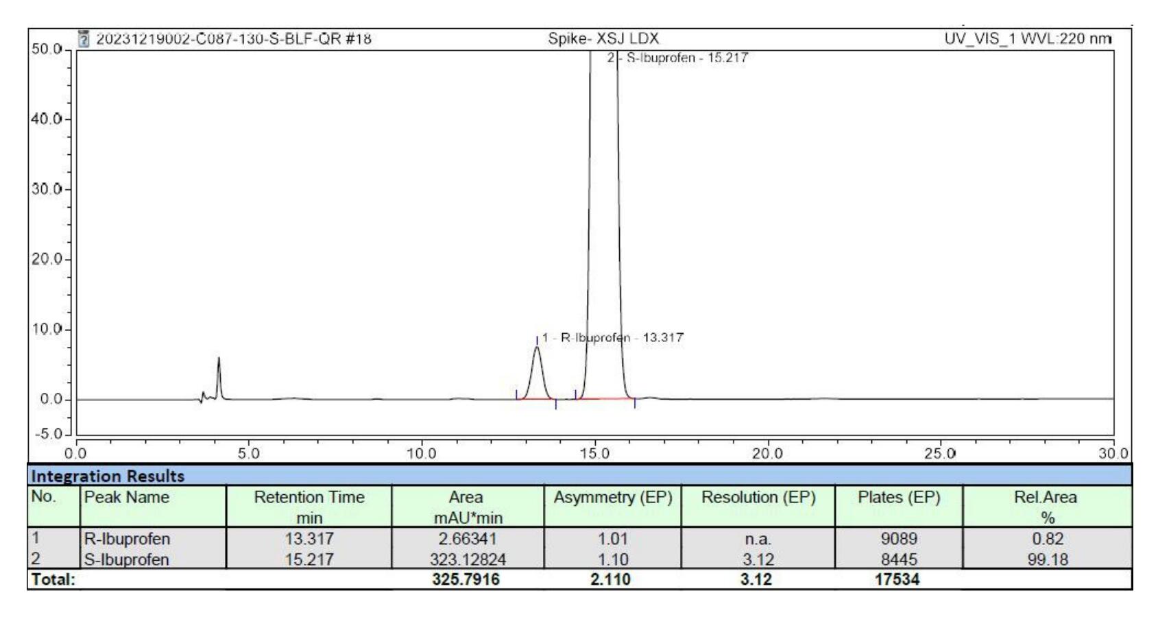 評(píng)語:該款反相手性色譜柱相比藥典的正相方法,采用簡單的反相流動(dòng)相體系,更為實(shí)用方便。峰形對(duì)稱, 柱效高。藥典要求理論板數(shù)按右布洛芬峰計(jì)算不低于 2000,右布洛芬峰與左布洛芬峰之間的分離度應(yīng)大于