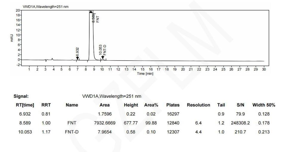 色譜柱 2:Chiral INC 3μm 250×4.6mm (FMG-JY3-I03) 流動(dòng)相:反相(咨詢銷售代表) 流速:0.9 ml/min 進(jìn)樣體積:10 μL 檢測(cè)波長(zhǎng):251nm 柱溫:30℃