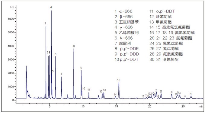 圖 1 添加水平為 0.2mg/kg 黃瓜中有機氯和擬除蟲菊酯類農藥多殘留檢測色譜圖