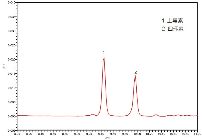 2、添加水平為1mg/kg蜂蜜中四環(huán)素檢測色譜圖
