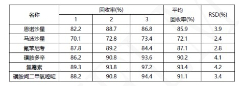 1、2.0 mg/kg豬肉中獸藥多殘留的添加回收率結(jié)果